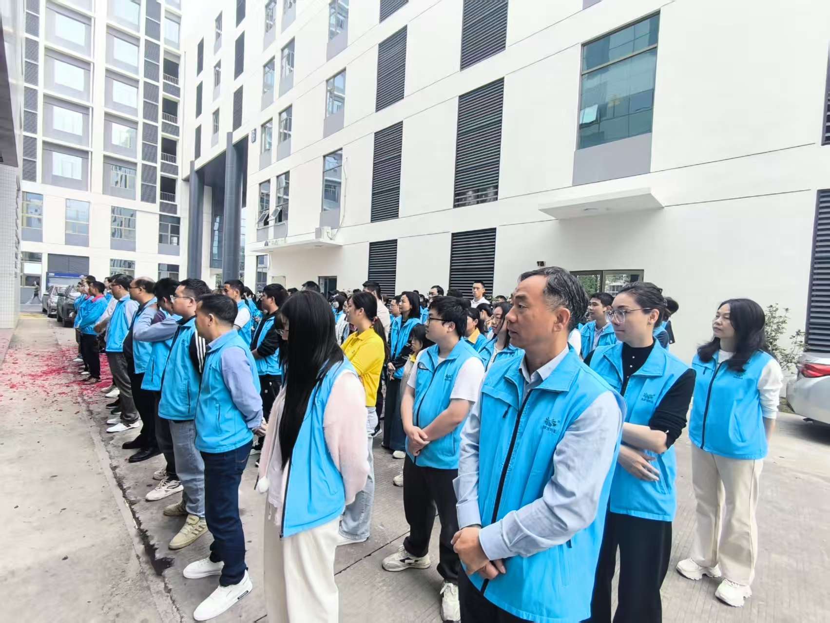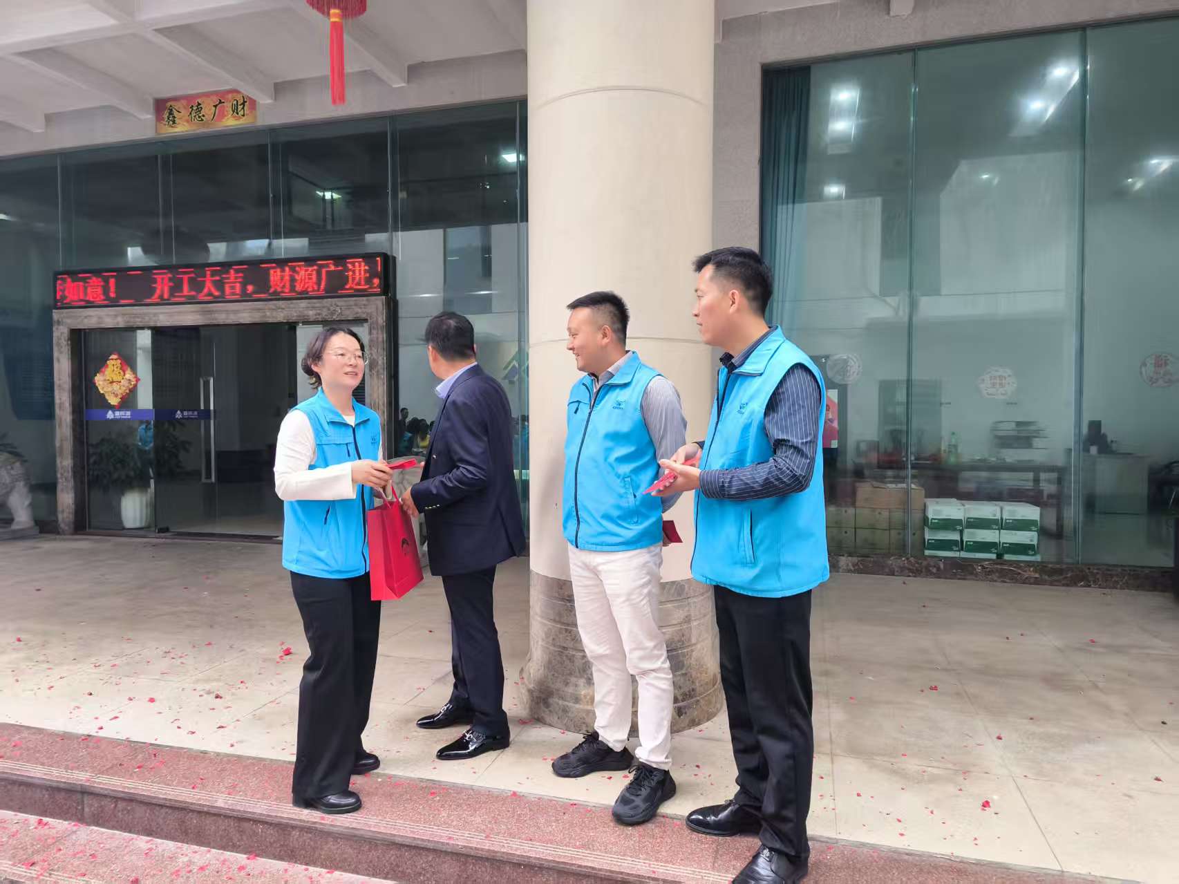 开工当日,公司广场上早已热闹非凡。身着统一蓝色工服的员工们精神抖擞、整齐列队,大家脸上洋溢着新春的喜悦与对未来的期许。公司门口红灯笼高挂,电子屏上 “开工大吉,财源广进” 的字样格外醒目,地面上铺满了喜庆的红色鞭炮碎屑,处处洋溢着浓浓的年味与奋进的气息。